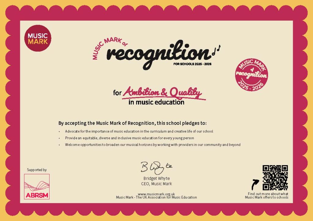 The Music Mark of Recognition is a new national programme from Music Mark, the UK’s leading organisation for Music education. The programme celebrates schools and Trusts that demonstrate a strong commitment to high-quality, inclusive Music provision and a belief in the value of Music as part of every young person’s education.